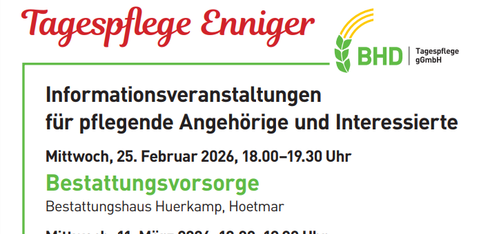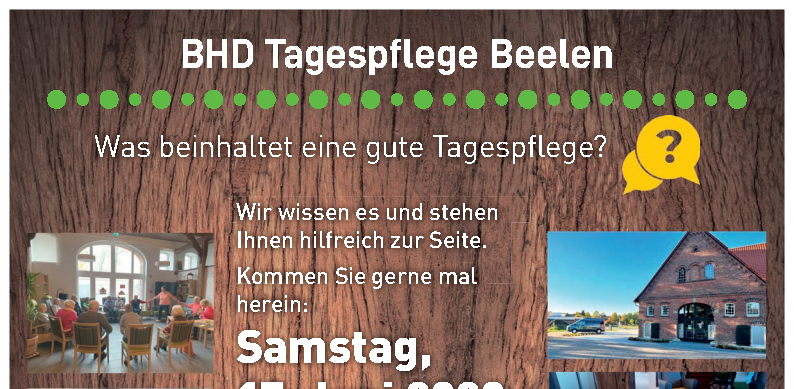 An die Sozialstation angegliedert sind die BHD Tagespflege gGmbH, die seit 2020 eine Tagespflegeeinrichtung mit 21 Tagespflegeplätzen im neu gebauten Seniorenzentrum Enniger unterhält, sowie die BHD Tagespflege Beelen gGmbH, welche in ihrer Tagespflegeeinrichtung in einem 2021 charmant renovierten Fachwerkhaus Platz für 18 Tagespflegegäste bietet.