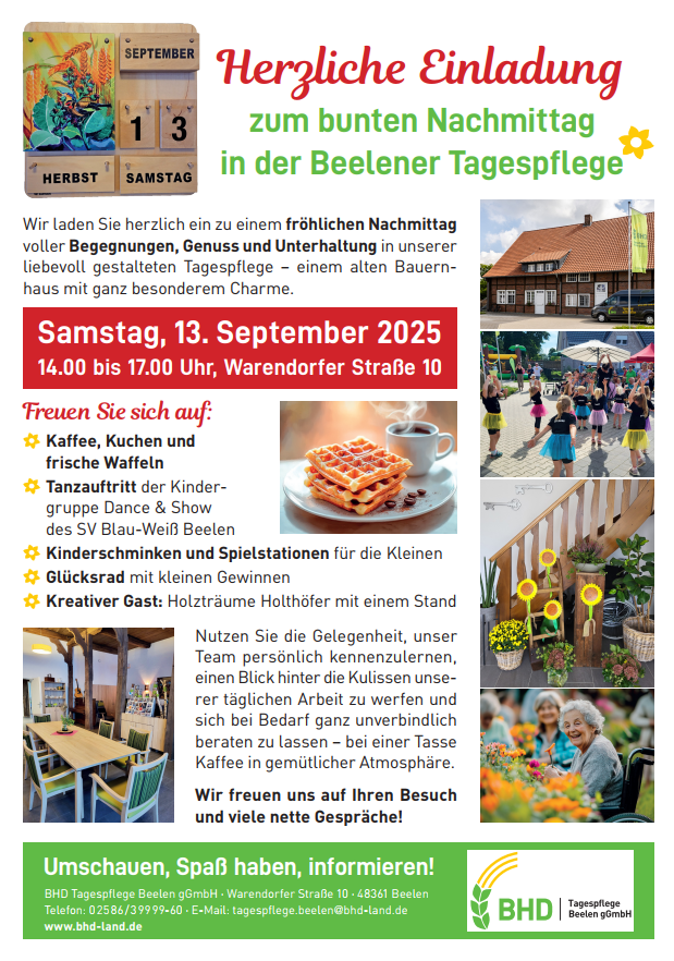Der Duft von frisch gebackenen Waffeln, Kaffee und selbstgebackenem Kuchen liegt in der Luft, fröhliches Kinderlachen erfüllt den Platz, bunte Farben beim Kinderschminken bringen kleine Gesichter zum Strahlen, Spielstationen und das Glücksrad laden zum Mitmachen und Gewinnen ein, ein schwungvoller Tanzauftritt der Kindergruppe des SV Blau-Weiß Beelen sorgt wieder für Begeisterung und ein kreativer Holzstand präsentiert handgefertigte Unikate zum Staunen und Entdecken. Nutzen Sie die Gelegenheit zu interessanten Gesprächen, wertvollen Infos und Einblicken hinter die Kulissen.